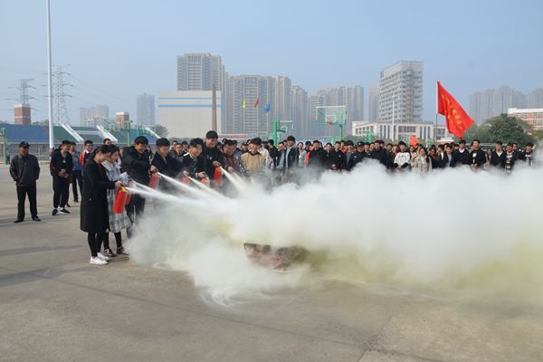 演练警报拉响后,同学们在辅导员、宿舍管理员的指挥、引导下有序快速撤离,紧急疏散到安全区域。消防灭火演练中,大家认真听取各类灭火器材的原理和使用方法,并挑选出60名学生进行实战灭火训练。