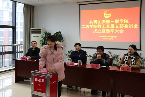 大会审议通过了《机关直属团支部和二级学院教工直属团支部团员大会选举办法》,按照《中国共产主义青年团章程》规定程序,到会全体团员以无记名投票方式,差额选举出陈东东、王祥、吴琦三位同志为第一届机关直属团支部委员会成员;高瑞、徐涛、徐泽慧、陆帆、陈泓伶五位同志为第一届二级学院教工直属团支部委员会成员。在随后召开的机关直属团支部和二级学院教工直属团支部第一次全体委员会议上,陈东东、高瑞两名同志光荣当选为团支部书记。