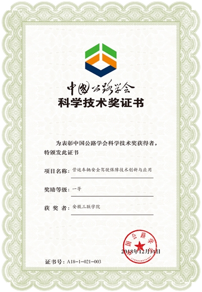 近日,中国公路学会正式公布,安徽三联学院、安徽三联交通应用技术股份有限公司等单位共同申报的 “营运车辆安全驾驶保障技术创新与应用”项目荣获2018年度中国公路学会科学技术一等奖。