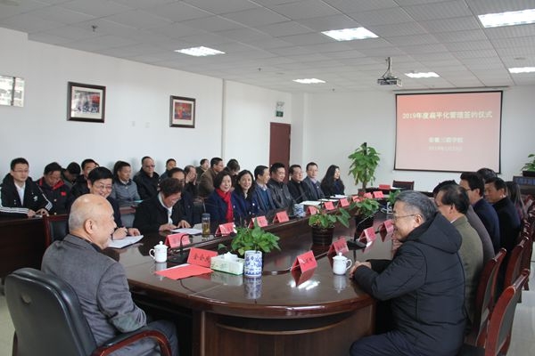 1月25日上午,安徽三联学院2019年度扁平化签约仪式在校图书馆T518会议室隆重举行。学校党政领导、各二级学院执行院长及各部门负责人出席签约仪式。签约仪式上金会庆校长分别与10个二级学院扁平化管理责任人签订目标责任状。
