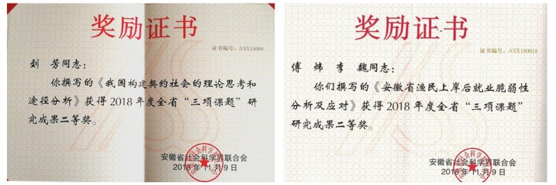 近日,省社科联发布《关于奖励2018年度省属社会组织“三项课题”研究优秀成果和先进单位的决定》,我校经济管理学院傅炜、李魏撰写的《安徽省渔民上岸后就业脆弱性分析及应对》及思政部刘芳撰写的《我国构建的契约社会的理论思考和途径分析》获二等奖。