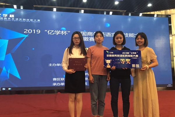 5月10–11日,第二届全国高等院校商务英语实践技能大赛(安徽赛区)在滁州学院举行。由我校外语学院吴新燕老师指导并带队,2016级本科商务英语专业顾悦、汪敏、张昌婷组成的代表队参加了比赛,与全省20所本科高校代表队同台竞技,经过软件平台商务知识测试和现场商务全英文竞演问答两个环节的激烈比试,最终取得了二等奖的好成绩。