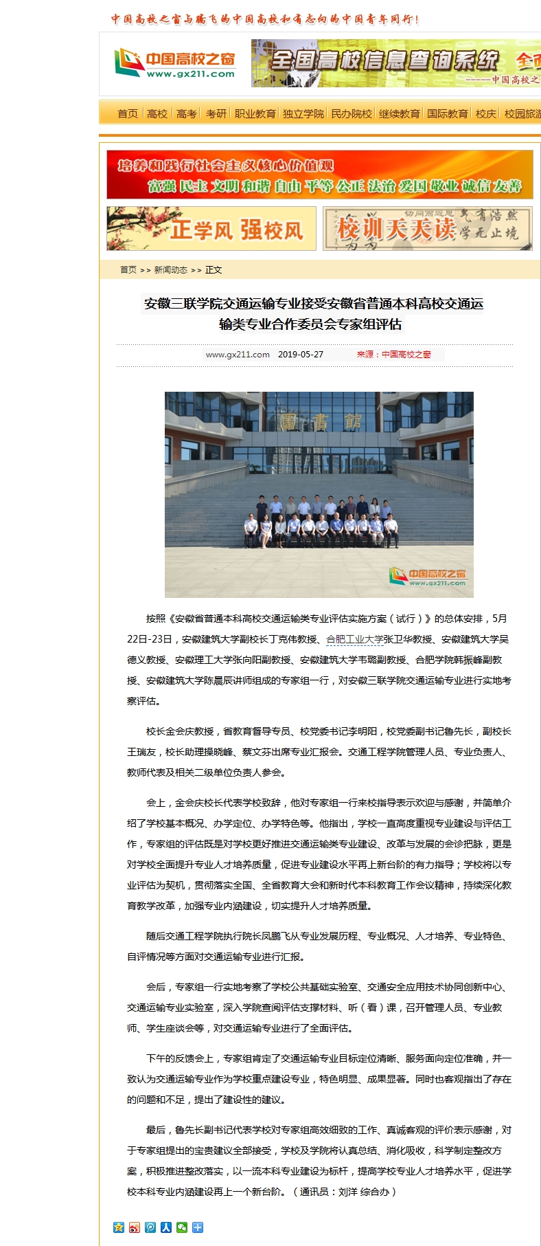 中国高校之窗:安徽三联学院交通运输专业接受安徽省普通本科高校交通运输类专业合作委员会专家组评估