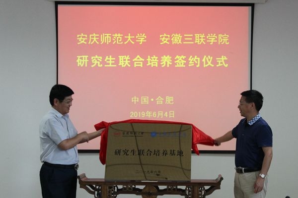 6月4日上午,安庆师范大学与我校联合培养硕士研究生签约暨研究生联合培养基地揭牌仪式在我校图书馆五楼会议室举行。安庆师范大学党委常委、副校长汪时珍,党委常委、研究生院院长(党委研究生工作部部长)吴琼,计算机与信息学院院长王一宾,研究生院副院长(党委研究生工作部副部长)王开友以及研究生院教育培养办公室耿晓东等莅临我校签约。我校党委副书记鲁先长,副校长姜发根,校长助理操晓峰、蔡文芬、江秀丽,计算机工程学院院长陈蕴、科研处处长罗忠等出席会议,相关二级学院及科研处工作人员参加会议。会议由姜发根主持。
