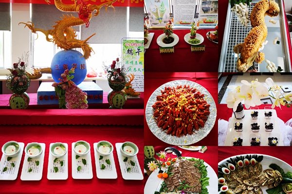 美食展台上中国传统雕塑龙飞凤舞竖在展桌中央,围绕着雕塑摆满了各色佳肴,有西式甜点、中式糕点、酸菜鱼、海鲜等,琳琅满目的美食让人垂涎三尺;各色的雕花更是出神入化,怀中抱着琵琶的温文尔雅的女子、展翅冲天的凤凰、各色玫瑰花争相绽放、更有梅兰竹菊四君子食物雕花;此次美食节不但是一场舌尖上的盛宴,更是一场视觉盛宴。