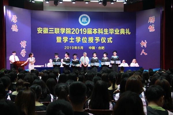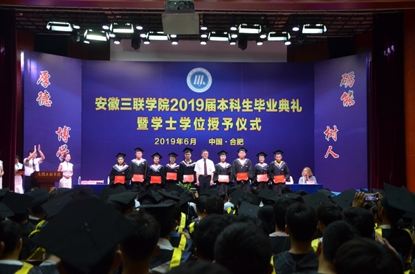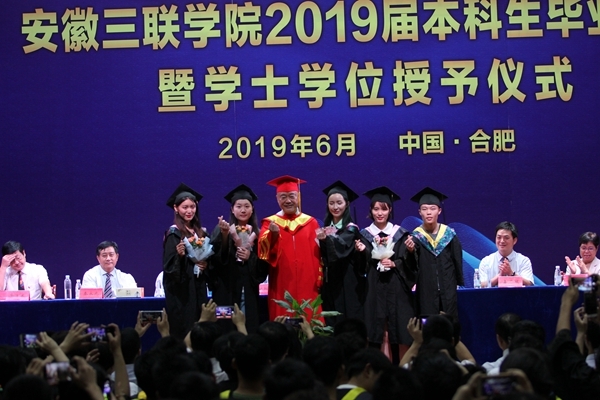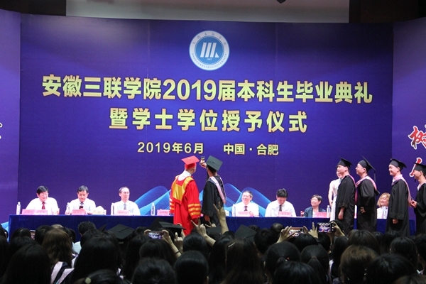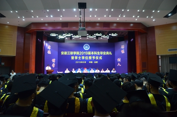 夏日灿烂,时节如流。一年一度的毕业季如期而至,六月的三联学院洋溢着收获的喜悦,也充满着离别的不舍。6月19日、20日,安徽三联学院2019届本科生毕业典礼暨学士学位授予仪式按照文理科于图书馆多功能厅(主会场)和学术报告厅(分会场)举行。校长、校学位评定委员会主席金会庆教授,校董事长余皖生,省教育督导专员、校党委书记李明阳,及副校长姜发根、张世伟、金美莲、秦永元、王瑞友、金哲出席毕业典礼并在主席台就坐。校长助理、各部门负责人、二级学院领导、老师代表出席典礼,学校2019届3600多名本科毕业生身着学士服参加典礼,会场气氛热烈,典礼由校党委副书记鲁先长主持。
