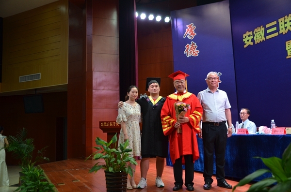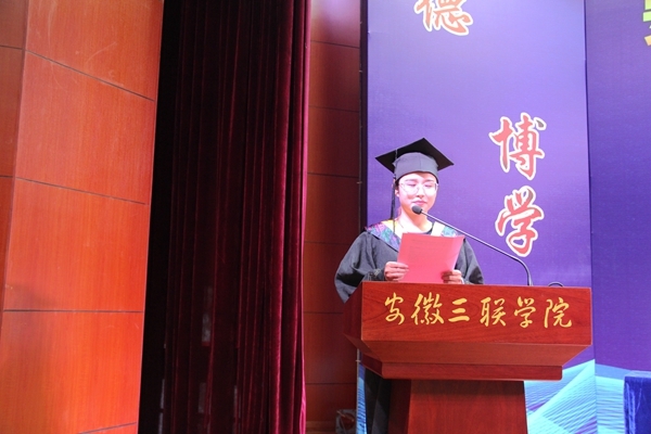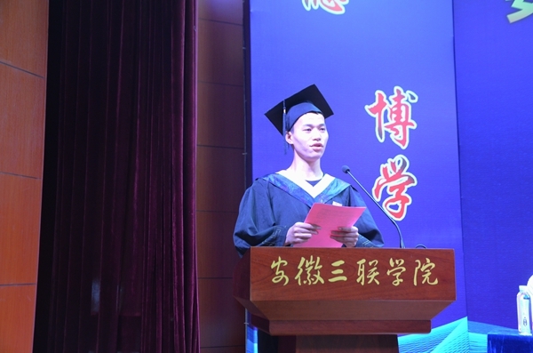 毕业生代表经济管理学院李超发表感言,他回顾了在三联学院的成长经历,重温了大学美好岁月,并代表毕业学子向无私奉献的领导和老师们表达感激之情,他表示不会忘记母校的滔滔恩情,不会忘记老师的谆谆教诲,将秉承“厚德博学 励能树人”的校训精神,不断地努力,不断地拼搏,砥砺前行,不辱使命。