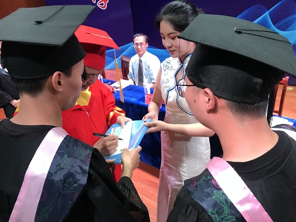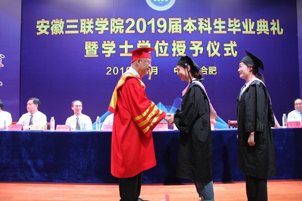 随后,余皖生董事长为2019届省级品学兼优毕业生代表颁发荣誉证书,李明阳书记为2019届本科毕业生代表颁发毕业证书和学士学位证书。