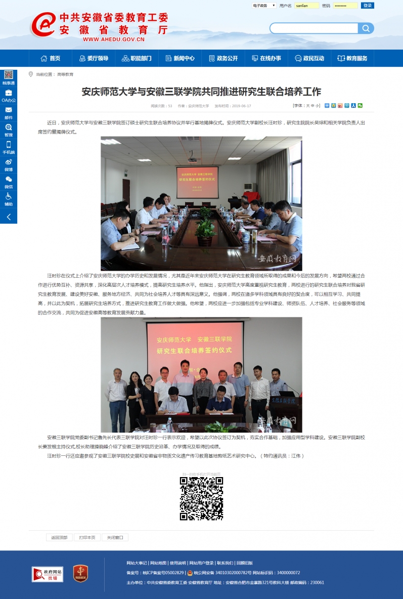 安徽教育网:安庆师范大学与安徽三联学院共同推进研究生联合培养工作