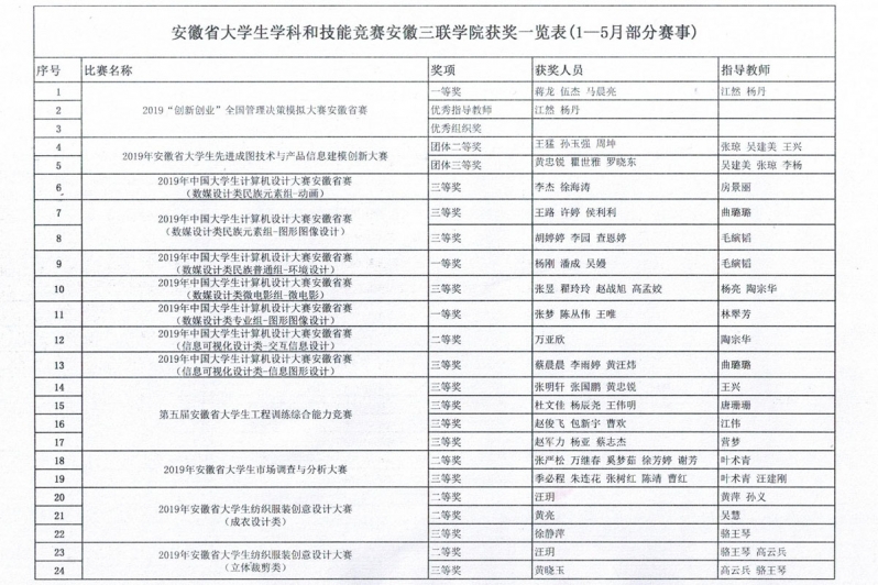 近日,安徽省教育厅下发了《关于公布2019年安徽省大学生学科和技能竞赛1—5月部分赛事获奖名单的通知》,我校在2019年创新创业全国管理决策模拟大赛、安徽省大学生先进成图技术与产品信息建模创新大赛、中国大学生计算机设计大赛、安徽省大学生工程训练综合能力竞赛、安徽省大学生市场调查与分析大赛、安徽省大学生纺织服装创意设计大赛等多项赛事中取得佳绩。