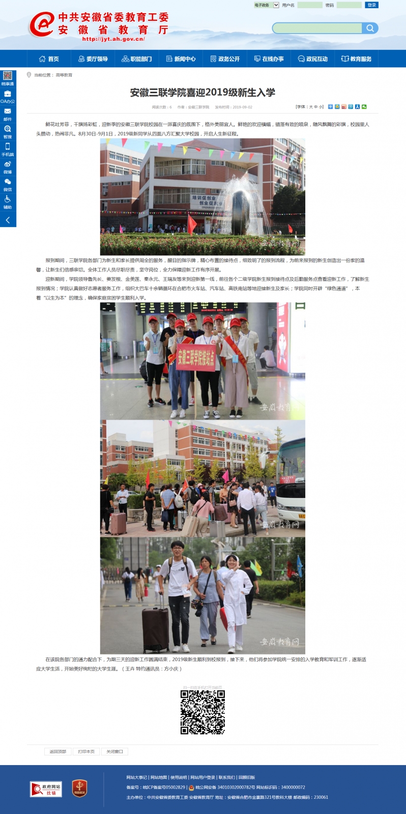 安徽教育网:安徽三联学院喜迎2019级新生入学