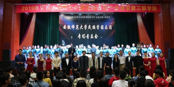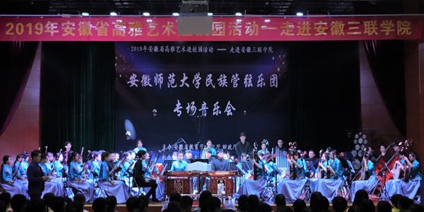 为丰富我校校园文化生活,提升师生文化品位,增强文化育人效果,10月11日晚,由安徽省教育厅、文化厅、财政厅主办,安徽师范大学承办的高雅艺术进校园——安徽师范大学民族管弦乐团专场演出在我校图书馆多功能厅隆重举行。来自安徽师范大学民族管弦乐团的演员们给师生们带来了一场精彩的视听盛宴。安徽师范大学民族管弦乐团音乐总监王景旭,安徽三联学院副校长秦永元,校长助理蔡文芬,有关部门负责人以及各二级学院600余名师生代表共同观看了演出。