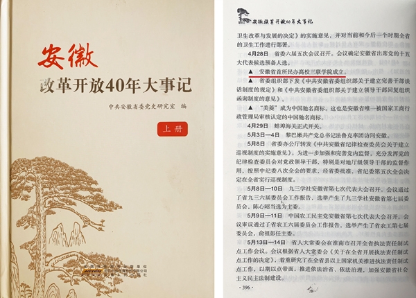 为庆祝改革开放40周年,集中反映安徽改革开放40年的光辉历程和伟大成就,由中共安徽省委党史研究院编写,时代传媒股份有限公司、安徽人民出版社出版的《安徽改革开放40年大事记》正式发行,“1997年4月28日,安徽省首所民办高校三联学院成立”被记载入册。