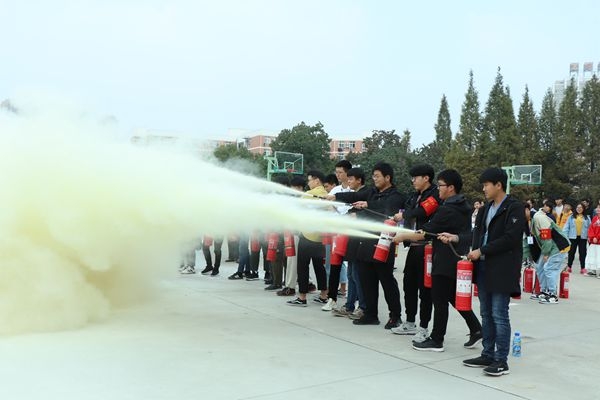 整场演练活动分两个阶段完成,第一阶段为地震、火灾逃生疏散;第二阶段为消防灭火演练。在第一阶段的演练中,听到报警后,学生在辅导员、宿舍管理员、校卫队员、消防志愿者的指挥、引导下有序快速撤离,紧急疏散到安全区域。在第二阶段的消防灭火演练中,学生认真听取了灭火器材的原理和使用方法,并分7组进行实战灭火训练。