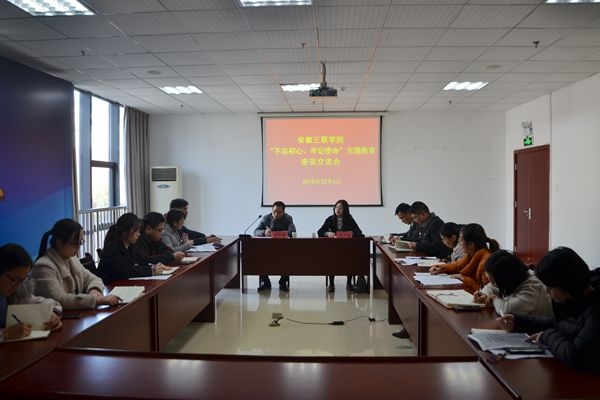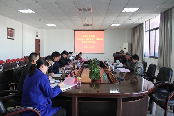 12月3日下午,学校党委领导班子在图书馆518会议室召开“不忘初心、牢记使命”主题教育专题民主生活会。省委第十一巡回指导组组长刘飞跃、副组长张敏、组员魏亚东到会指导。学校党委领导班子成员李明阳、鲁先长、姜发根、王瑞友、李斌、占海文、宋梦岚参加会议,校党员领导金美莲、蔡文芬、范兆红列席会议。