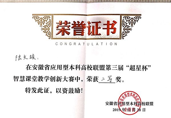 2019年12月28日,安徽省应用型本科高校联盟第三届“超星杯”智慧课堂教学创新大赛现场决赛在巢湖学院落下帷幕,我校教师陆文骏在此次大赛中表现优异,荣获二等奖的好成绩,张悦悦团队获得三等奖,王娜获得个人优秀奖,牛海侠团队获得团队优秀奖。