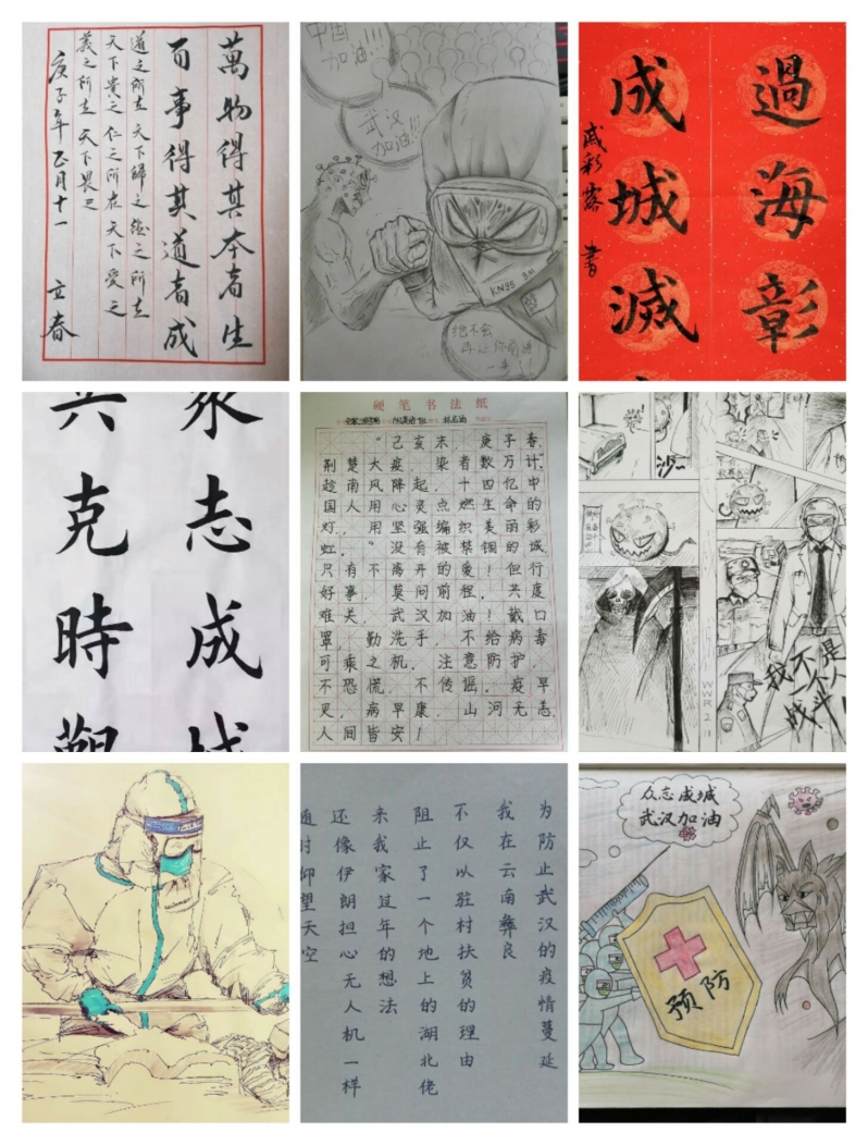 仅仅5天时间,在全校10个二级学院团总支的不懈努力下,校团委共收到文创作品247份,其中包括海报作品《黎明的那道光》、《逆行者》等128份,短视频作品《冬已至,春可期》、《终结者》等63份,书画作品《万众一心 决不后退》、《荆楚大疫》等56份;新媒体中心制作原创 H5“三联人为武汉加油”微信接力,共有 2.3 万师生及校友接力,以表明坚决打赢疫情防控救治这场硬仗的决心。