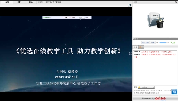 为保障疫情防控期间“停课不停教,停课不停学”教学活动顺利进行,安徽三联学院前期通过校教师发展中心,利用各类教学平台积极开展教师线上培训,在此基础上组织开展学校线上教学工作坊直播讲座系列活动。3月15日上午,首场直播讲座“优选在线教学工具,助力教学创新”,通过安徽三联学院教师在线学习中心平台顺利开展,讲座由校教师发展中心和智慧教学工作坊共同举办。参加直播讲座的有全国其他高校教师和本校教师共计190多人参加。