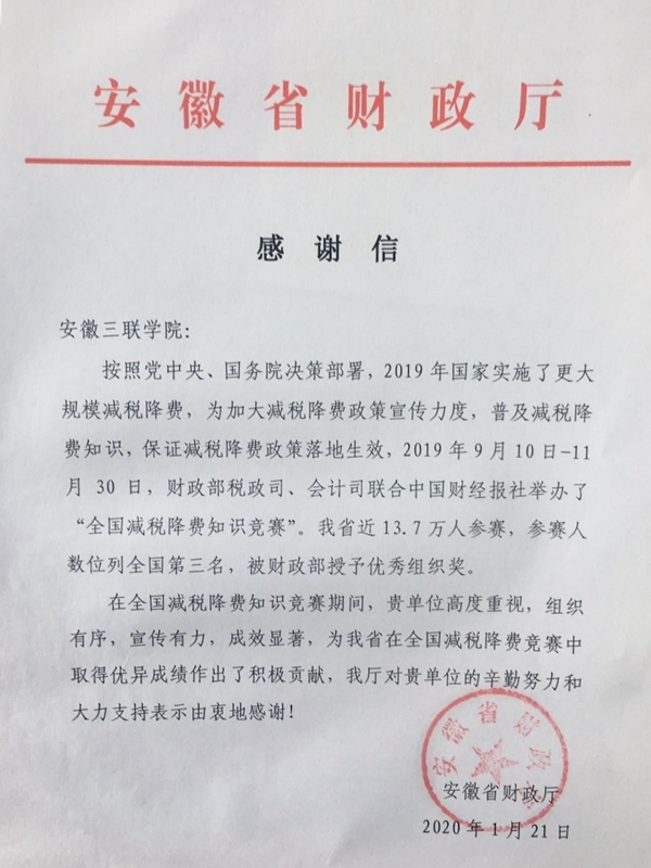 2020年1月21日,我校收到了安徽省财政厅发来的一封感谢信,省财政厅肯定了我校关于大赛的高度重视,组织有序,宣传有力,对我校为我省在全国减税降费竞赛中取得的优异成绩作出的积极贡献表示感谢。