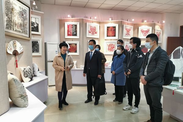 梁仁春一行首先参观了安徽省非物质文化教育传习基地—三联学院剪纸艺术研究中心。周鸣副院长向来宾们介绍了师生们创作剪纸艺术作品的创意和丰富内涵,大家感受到了剪纸文化之美和中华传统文化的魅力。