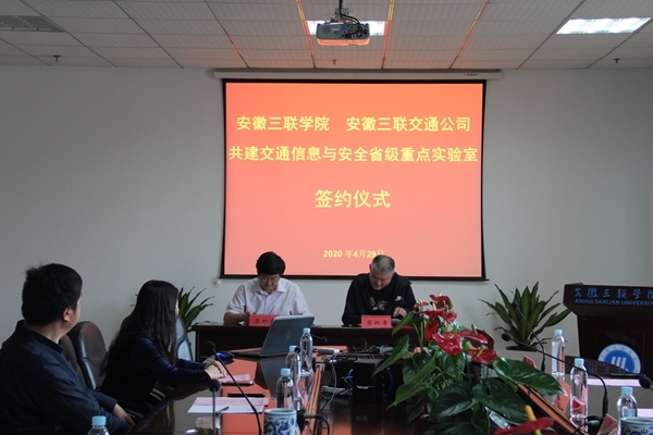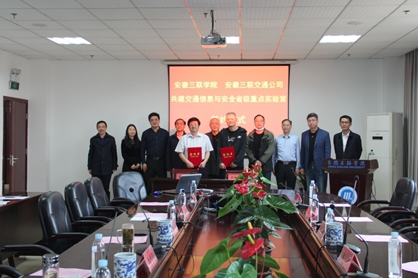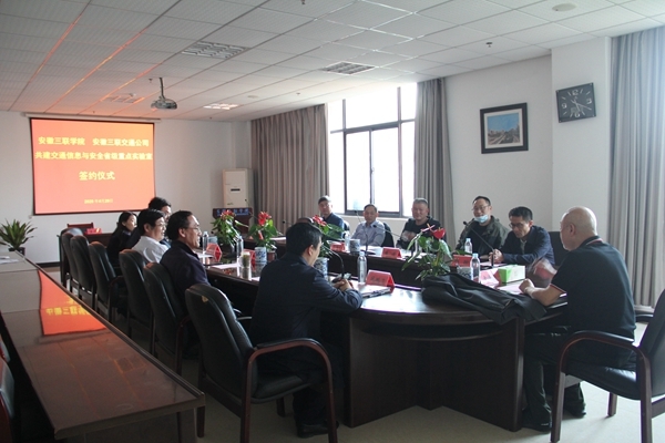 4月29日下午,我校与安徽三联交通应用技术股份有限公司(以下简称:三联交通)共建交通信息与安全省级重点实验室签约仪式在图书馆518会议室举行。三联交通总经理王江波,副总经理潘涛、张树林、唐毅、赵翀;安徽三联学院校长金会庆,党委副书记、副校长鲁先长,副校长姜发根、张世伟,财务总监范兆红,交通工程学院执行院长凤鹏飞参加签约仪式。仪式由副校长姜发根主持。