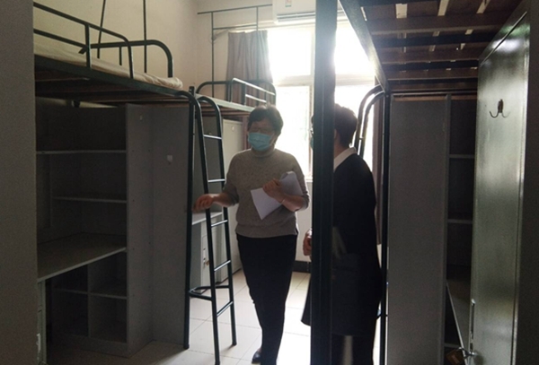 专家组一行听取了我校党委副书记、副校长鲁先长关于学校疫情防控和开学准备工作情况的汇报后,深入教室、食堂、宿舍、浴室、防疫仓库、隔离安置点进行实地察看,并通过交流询问、随机访谈的方式对我校教职员工应对紧急情况的处理能力进行了评估。