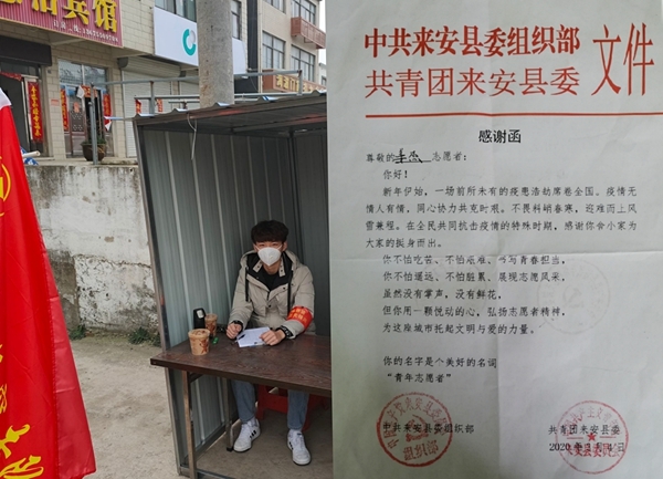 近日,电子电气工程学院收到来自共青团来安县委的一封感谢信, 2018级电子信息工程1班的姜杰同学在抗击疫情的特殊时期,积极参与家乡抗疫工作,主动申请到社区疫情防控一线参加战斗,用实际行动展现志愿者风采,全力为疫情防控奉献力量。(撰稿、摄影:陆帆 编辑:隋欣)