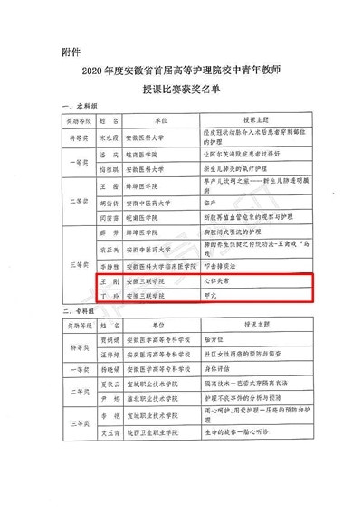 近日,由安徽省护理协会教育专业委员会主办的安徽省首届高等护理院校中青年教师授课比赛如期举行,来自安徽省内各护理院校代表参加比赛。我校护理学院王刚、丁玲两位老师获得本科组三等奖。(撰稿、摄影:方昌恒 编辑:隋欣)