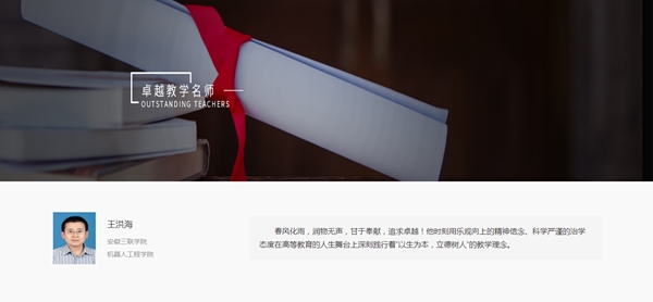 在庆祝第36个教师节之际,安徽省教育厅开展的“全省高校百位卓越教学名师、卓越教学新秀风采展示”活动中,由全省高校从省级教学名师、教坛新秀中推荐近两百名卓越代表,由省教育厅集中进行风采展示。我校机器人工程学院执行院长王洪海教授经个人申报,遴选推荐、学校评审等环节,成功入选安徽省百位“卓越教学名师”风采展示。