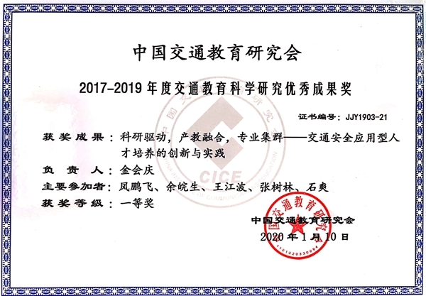近日,接中国交通教育研究会的通知,由校长金会庆教授主持,联合校企共同申报的《科研驱动,产教融合,专业集群——交通安全应用型人才培养的创新与实践》获2017-2019年度交通教育科学研究优秀成果一等奖,也是全国唯一获得该项殊荣的民办本科高校。