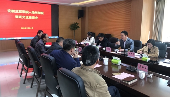 调研座谈会上,姜发根副校长简要介绍了学校近几年产教融合和教育教学改革的基本情况,并就此次调研背景和重点内容作了说明。池州学院柳友荣校长介绍了该校教育教学改革及产教融合发展情况,指出该校立足校情,着力特色,坚持从地方需求出发,对接企业集团、发展政校企合作,打造了课堂革命、劳动教育和行业学院等亮点;阳光宁副校长则以该校教育教学改革成效出发,说明了教学体系设计、教学运行和实施、教学诊断与保障等政策措施;教务处黄海生处长则补充说明了该校专业分类转型、校企合作、教育教学项目建设与创业孵化等内容。