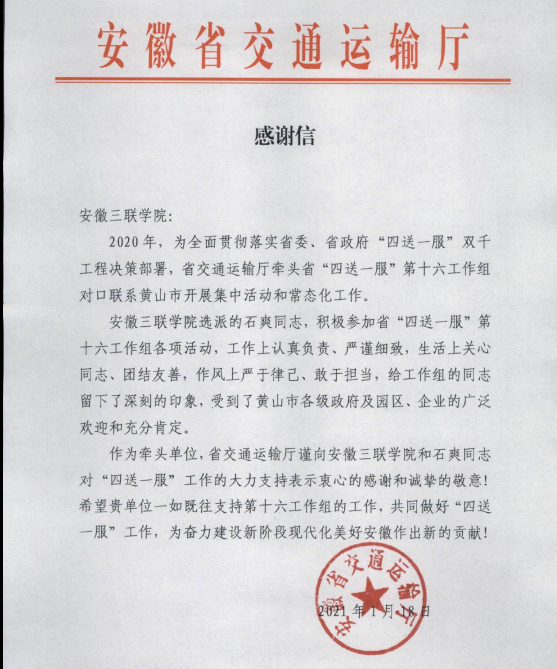 近日,安徽省交通运输厅就我校“四送一服”双千工程工作发来感谢信,对我校给予省“四送一服”第十六工作组的支持表示感谢,对我校选派的石爽博士表示高度认可。