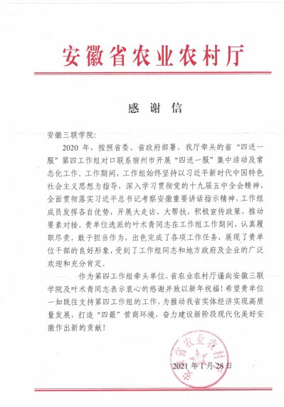 近日,安徽省农业农村厅就我校“四送一服”双千工程工作发来感谢信,对我校给予省“四送一服”第四工作组的支持表示感谢,对我校选派的叶术青博士表示高度认可。