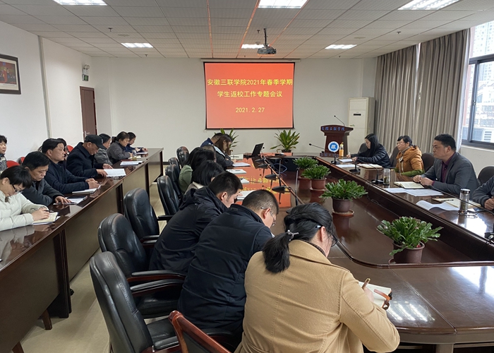 会上,李燕传达了《安徽省高等学校新冠肺炎疫情防控2021年春季开学工作指南》和《安徽三联学院春季学期学生错峰开学报到方案》文件精神;各二级学院汇报了学生返校工作准备情况,学生处、总务处、保卫处、校医院等部门分别对学生返校及近期工作的重点进行部署。会中,与会人员就学生返校工作中的具体问题进行广泛交流。