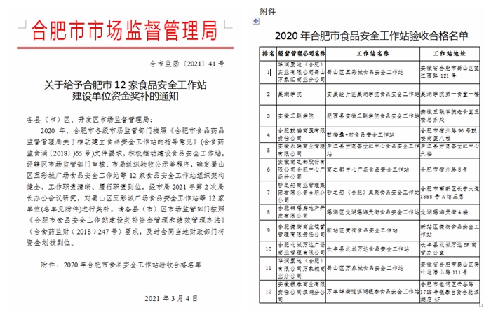 近日,合肥市市场监督管理局发布2020年合肥市食品安全工作站验收合格名单,肥西县安徽三联学院食品安全工作站顺利通过验收。