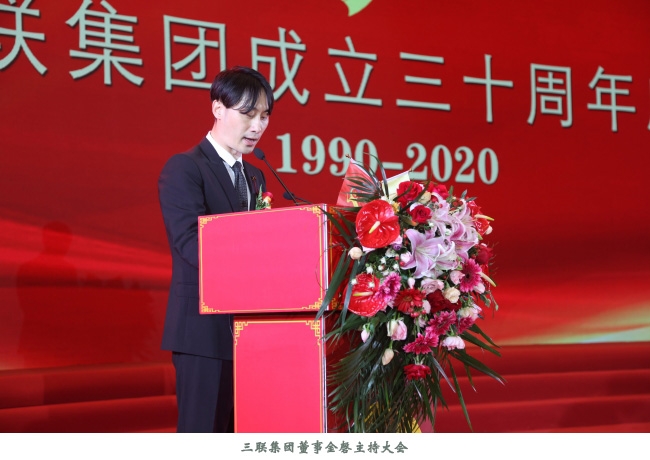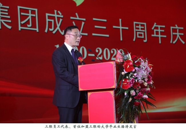 “第一个加盟三联的大学毕业生”、三联创业奖章获得者、三联交通公司董事兼副总经理潘涛,代表三联集团2000多名员工发言。潘涛表达了对三联三十华诞的感慨与祝福,他表示自己追随金会庆教授的脚步来到三联,亲历了三联产业发展的风云变幻,并有幸见证三联创造的一个又一个奇迹神话。三十年来,他深切感受到三联的初心与愿景始终不变,相信三联定能够在各领域齐头并进,续写“跨越发展正当时”的新篇章!