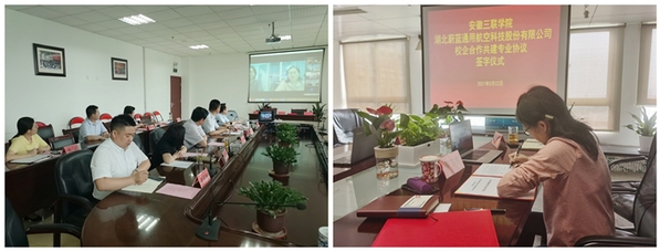 5月22日下午,学校与湖北蔚蓝通用航空科技股份有限公司在T518会议室举行校企合作共建专业线上签约仪式。公司集团副总裁李方林,机务总工程师侯鹏涛,营销中心副总经理余亚锋等企业领导,学校党委副书记、副校长鲁先长,副校长姜发根、蔡文芬,电子信息工程学院、机械工程学院、综合办公室、财务处、教务处、实践教学部等部门负责人参加了仪式。仪式由姜发根主持。