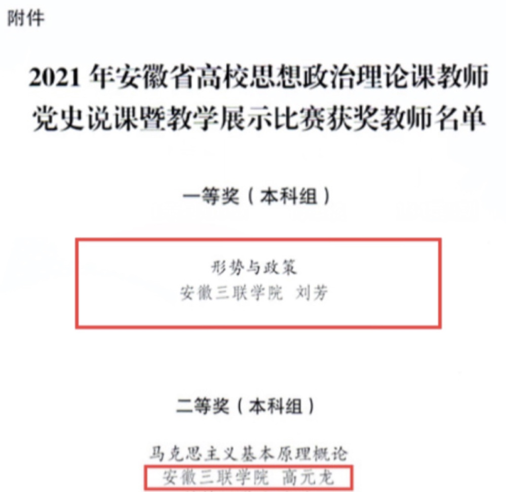 省委教育工委于6月4日公布安徽省高校思想政治理论课教师党史说课暨教学展示竞赛结果,我校马克思主义学院教师刘芳荣获“形势与政策”(本科组)一等奖,并作为此课程组别唯一一位推荐教师晋级全国高校思想政治理论课教学展示暨优秀课程观摩活动比赛。此外马克思主义学院教师高元龙以“马克思主义基本原理概论”(本科组)第二名(二等奖)的成绩入选推荐教师参加全国比赛。
