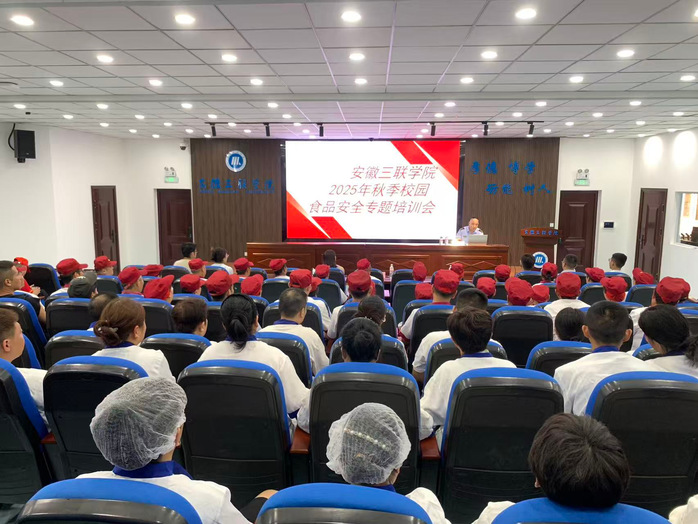 为进一步强化校园食品安全管理,提升食堂从业人员安全意识和操作规范,保证师生饮食安全,8月28日下午,后勤保障监管处在学校B01学术报告厅组织开展2025年秋季校园食品安全专题培训会。本次培训特邀肥西县市场监督管理局经开所所长丁常柱担任主讲专家,后勤保障监管处相关管理人员及各食堂员工参加培训。