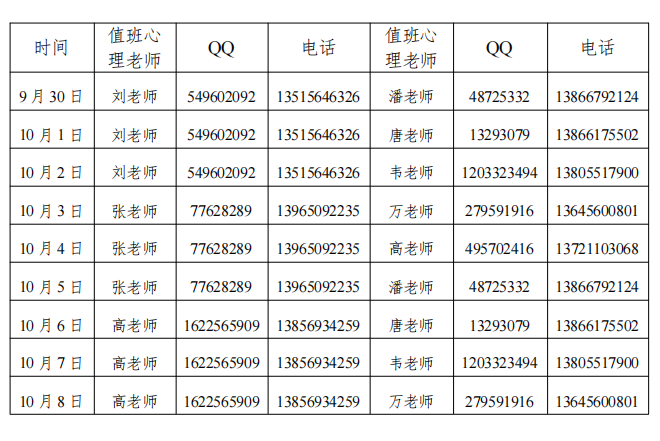 开展一个单元的心理辅导服务(紧急心理状况的疏导与调适),假期间,同学们可以通过QQ网络预约的形式进行个体心理辅导的预约,值班心理老师将根据同学们的需求以QQ视频通话、语音或文字的形式等开展个体心理辅导服务。值班心理老师将严格遵守保密原则。
