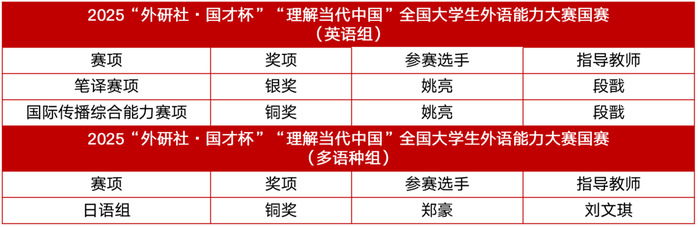 近日,2025“外研社·国才杯”“理解当代中国”全国大学生外语能力大赛国赛圆满落幕。我校参赛学子荣获1项银奖、2项铜奖,获奖成绩位居全省高校前列。