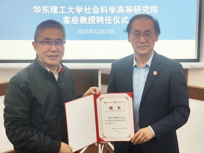 活动分为两个环节。第一环节中,研究院联合院长、我校校长特别助理张世伟教授受聘为华东理工大学社会科学高等研究院客座教授。华东理工大学党委常委、副校长、社会科学高等研究院院长阎海峰教授颁发聘书,并对与会嘉宾表示欢迎。他回顾了华东理工大学与我校的合作成果,并对未来协作提出展望。张世伟教授向华东理工大学表达感谢,并转达了三联创始人金会庆教授对三方合作的高度重视与殷切期待,同时对评审专家及各项目团队的辛勤工作致以谢意。本环节由华东理工大学人文社科处处长唐有财教授主持。