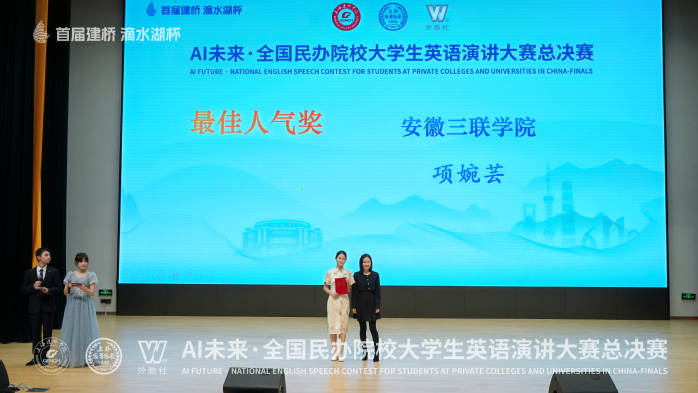 12月27日,首届“滴水湖杯”AI未来·全国民办院校大学生英语演讲大赛总决赛圆满落幕。我校文学部学子项婉芸表现出色,一举斩获总决赛一等奖和最佳人气奖。